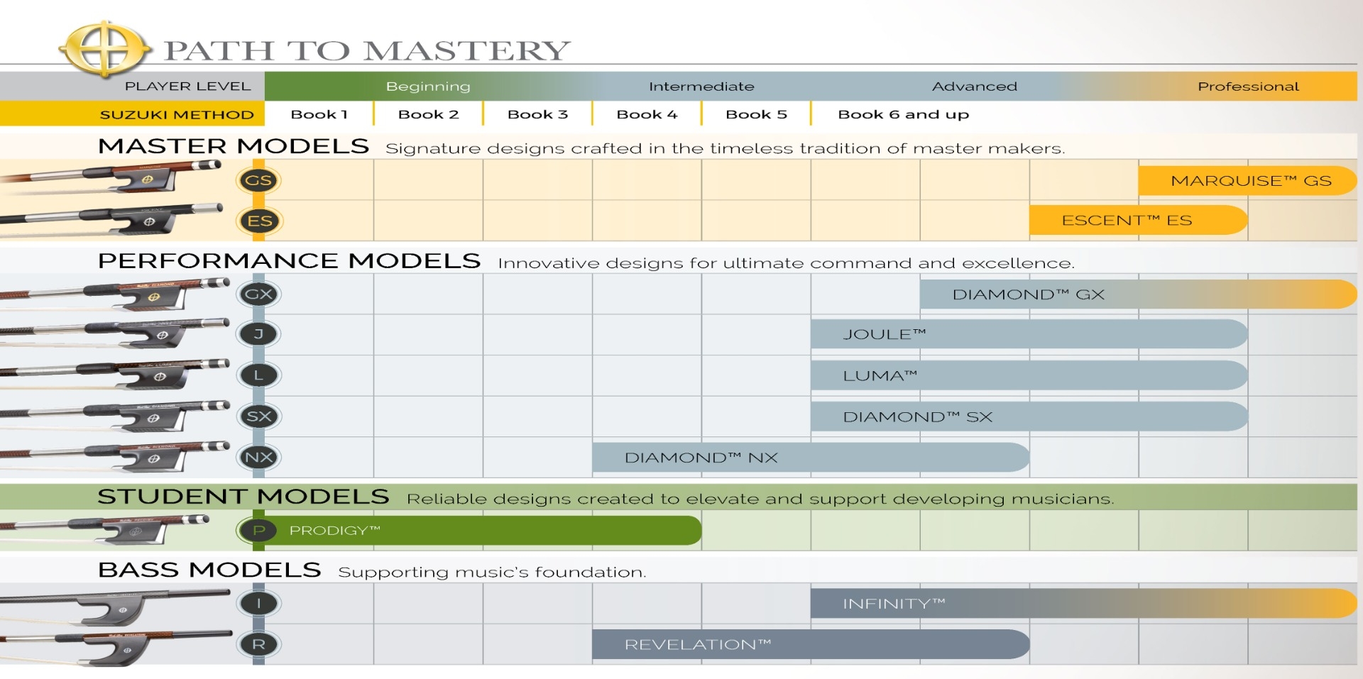 True to its name, the INFINITY offers limitless possibilities for musicians to explore. With ideal lightness, length, and balance, the bow allows players to toss off advanced techniques and strokes effortlessly while the breadth of hair produces a maximum sound.