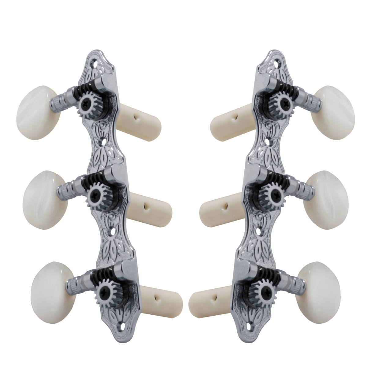 Excellence in materials and craftsmanship are the hallmark features of these classic machine heads. The die cast base provides a rigid foundation for the gear and worm, assuring perfect alignment and mesh. The pearloid buttons are attached with a tension screw to provide the feel of your preference. A bearing over the worm shaft provides additional support and enhances the smooth performance. Includes wood screws. With a 14:1 gear ratio.