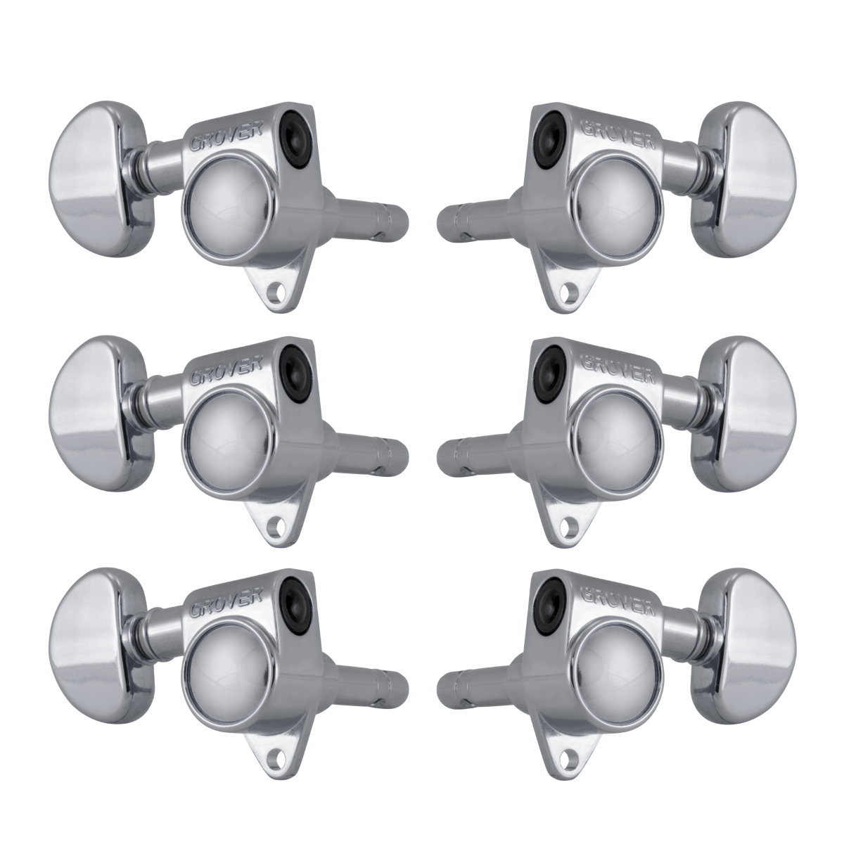 Grover Locking Rotomatics® give you the ease of use provided by a standard tuner and the positive locking of our internal cam post. Simply insert the string through the string hole, pull to tension by hand and begin tuning. As you start to tune, only the locking cam in the string post turns. Once the string is locked, the string post begins to turn allowing you to bring the string to pitch. In less then one revolution of the string post, you will be in tune, to stay in tune. Gear ratio is 18:1.