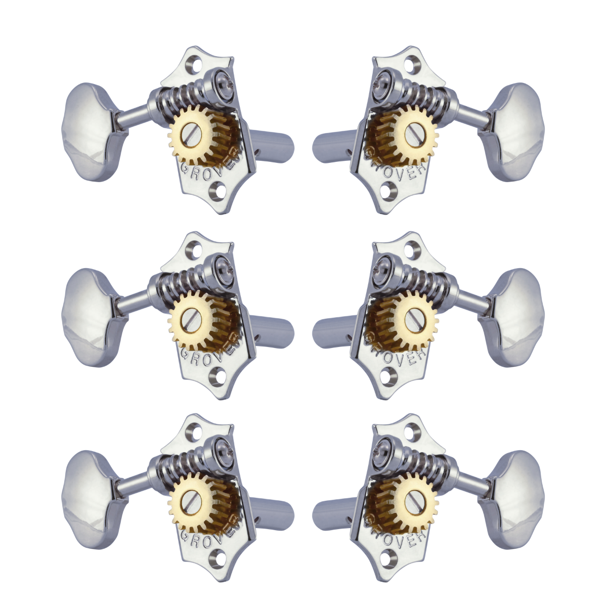 The 18:1 gear ratio Grover® Sta-Tite™ machine head. The classic styling of the Sta-Tite™ returns with the Grover® name. The butter bean button identifies this as the original. A 18:1 gear ratio provides precise tuning. Wood screws, washers, and bushings included.