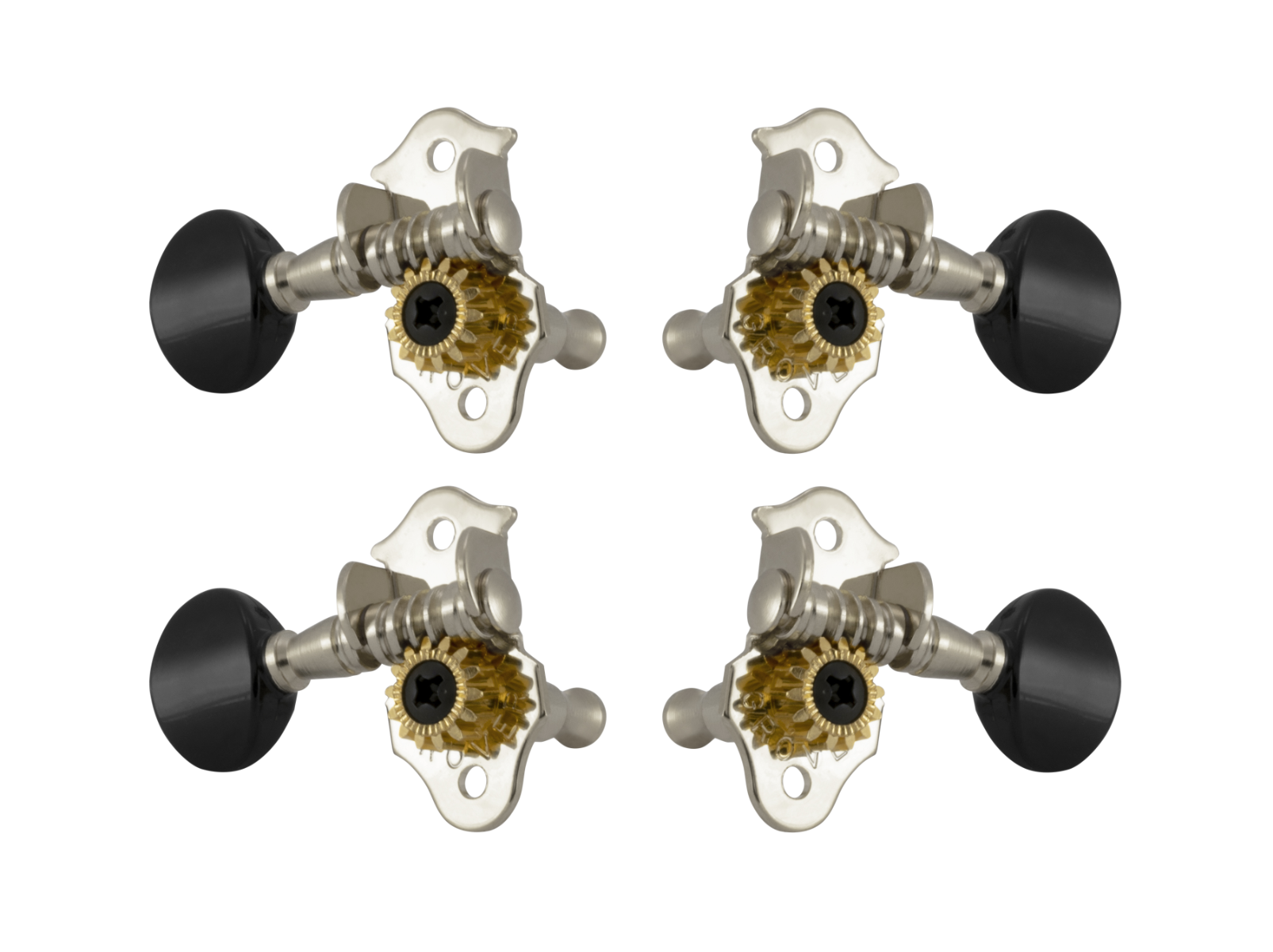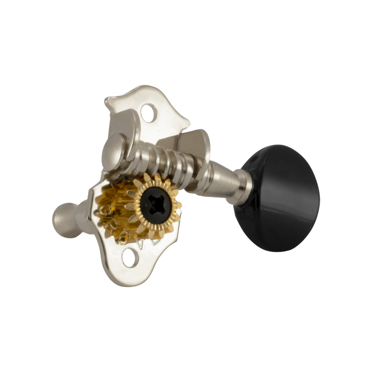 The one-piece back plate, brass gear, die cast button and knurled bushings are the same as those used on the Sta-Tite™ guitar machine head. The string post has been shortened to 1 inch with the string hole .775” from the back of the base. 14:1 gear ratio provides for accurate tuning. Includes bushings and wood screws.