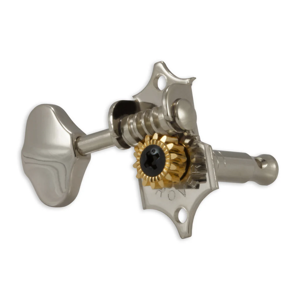 The Original Grover® Sta-Tite™ machine head. The classic styling of the Sta-Tite™ returns with the Grover® name. The butter bean button identifies this as the original. A 14:1 gear ratio provides precise tuning. Wood screws, washers, and bushings included.