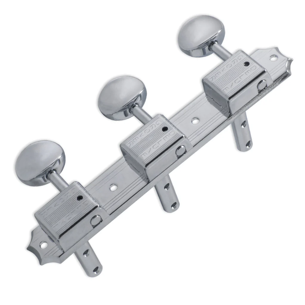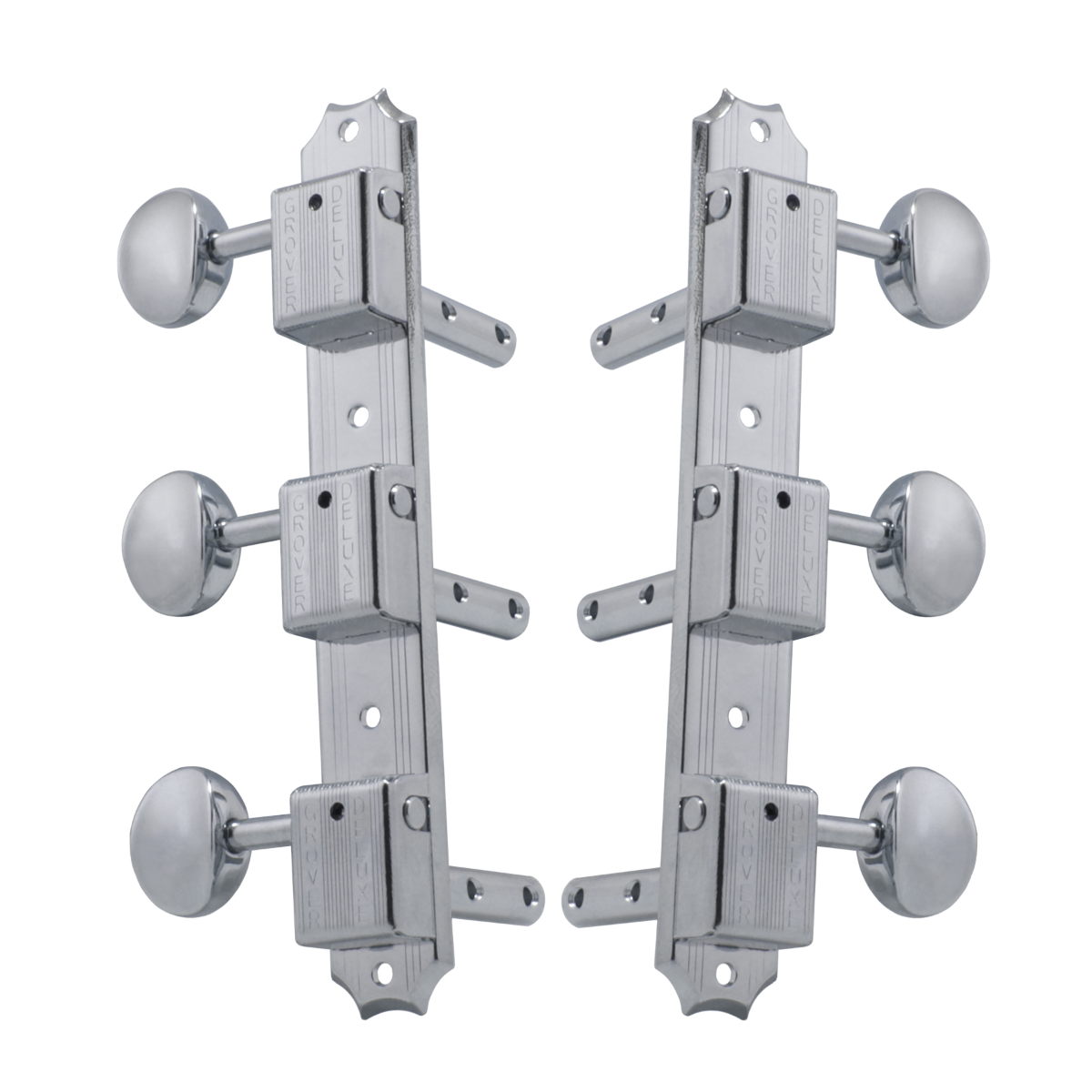 The Grover® deluxe machine heads are mounted three to a plate for the vintage look that has been popular for decades. The stamped back plate provides a sturdy base for mounting vertically or horizontally on the head stock. The housings are securely fastened to the base insuring proper gear and worm alignment for accurate tuning. Bushing and screws included. With a 14:1 gear ratio.