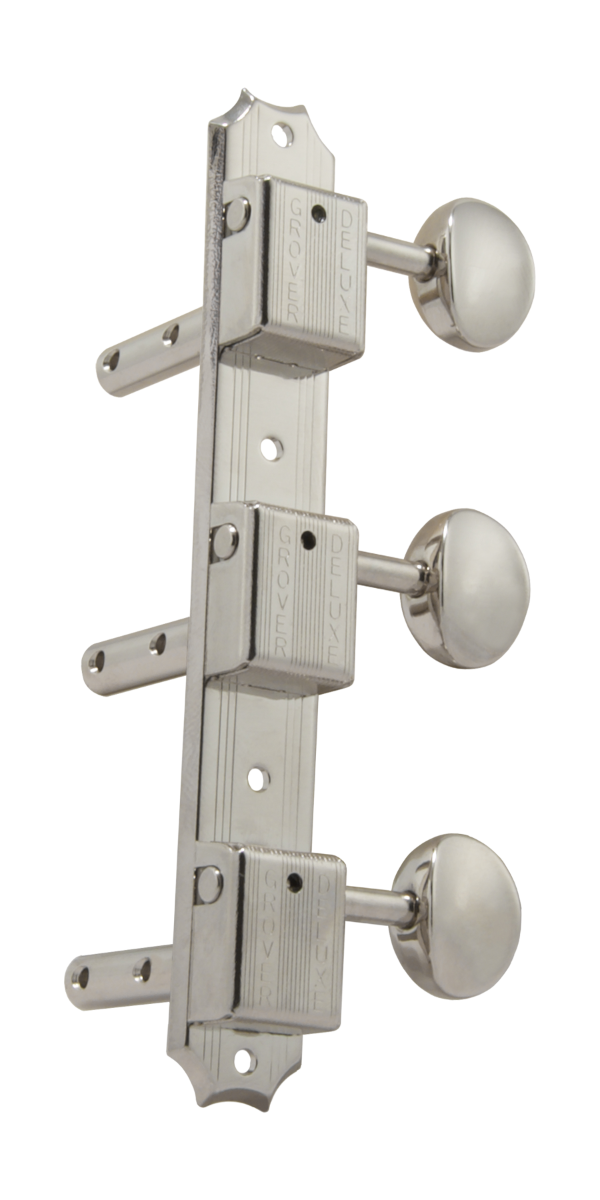 The Grover® deluxe machine heads are mounted three to a plate for the vintage look that has been popular for decades. The stamped back plate provides a sturdy base for mounting vertically or horizontally on the head stock. The housings are securely fastened to the base insuring proper gear and worm alignment for accurate tuning. Bushing and screws included. With a 14:1 gear ratio.