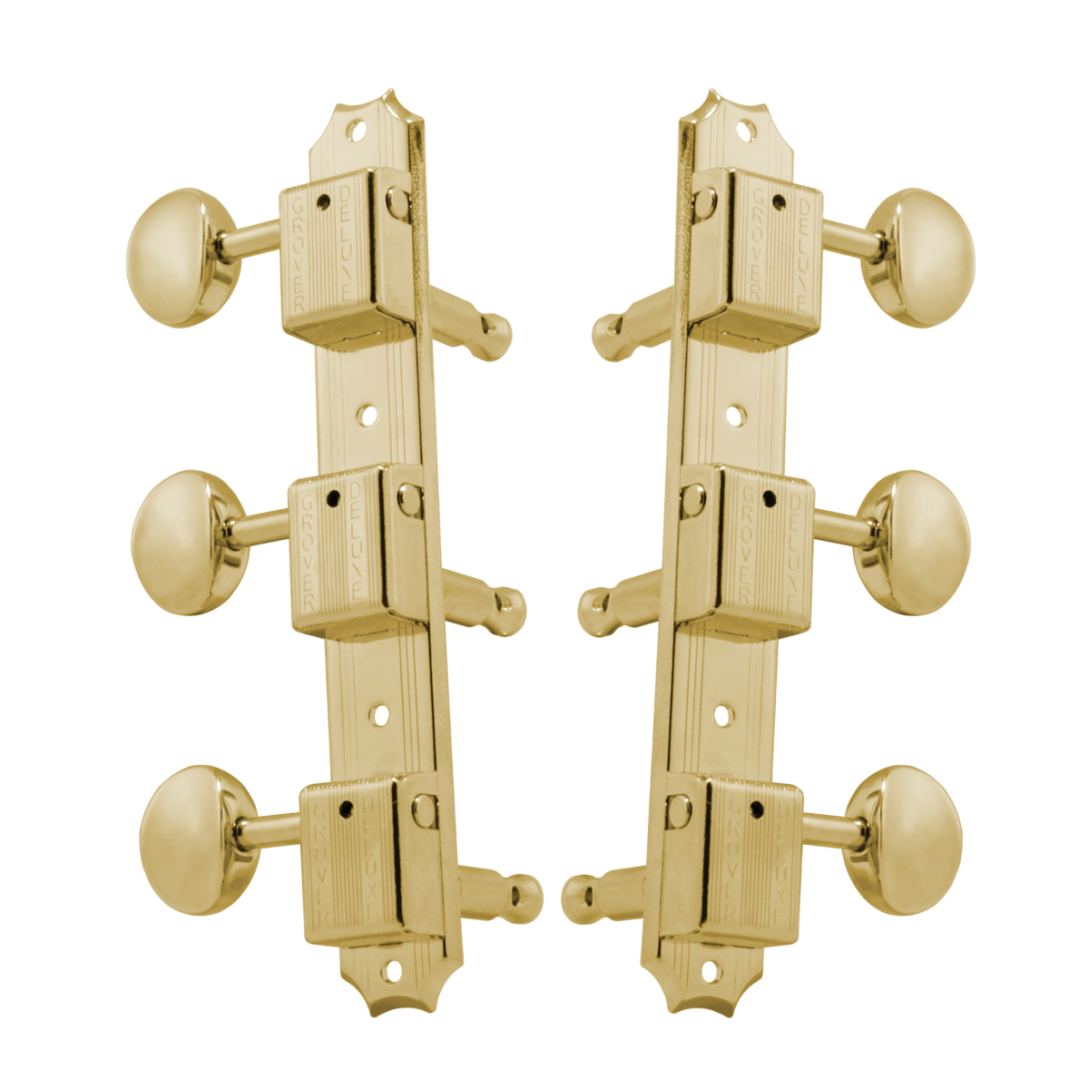 The Grover® deluxe machine heads are mounted three to a plate for the vintage look that has been popular for decades. The stamped back plate provides a sturdy base for mounting vertically or horizontally on the head stock. The housings are securely fastened to the base insuring proper gear and worm alignment for accurate tuning. Bushing and screws included. With a 14:1 gear ratio.