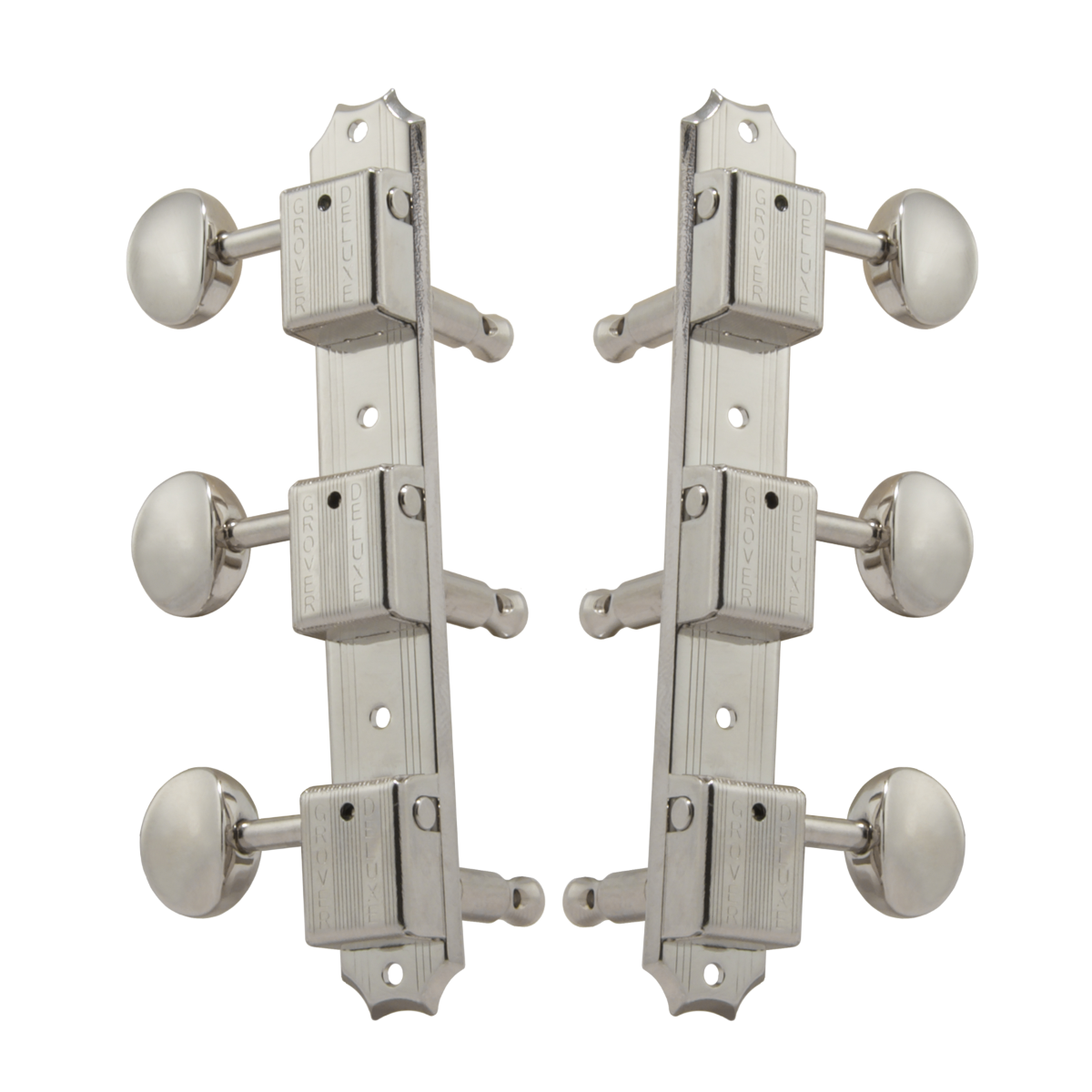 The Grover® deluxe machine heads are mounted three to a plate for the vintage look that has been popular for decades. The stamped back plate provides a sturdy base for mounting vertically or horizontally on the head stock. The housings are securely fastened to the base insuring proper gear and worm alignment for accurate tuning. Bushing and screws included. With a 14:1 gear ratio.