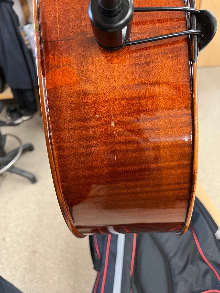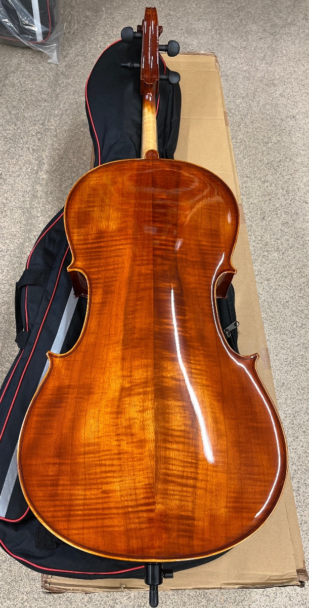 Hand-Carved, Solid Straight-grained Spruce top; Hand-Carved, Solid Flamed Maple Back, Ribs, Neck and Scroll; Ebony Fingerboard and Pegs; Seasoned Maple Bridge; Ebony Tailpiece; Carbon Fibre Endpin; Steel Strings.