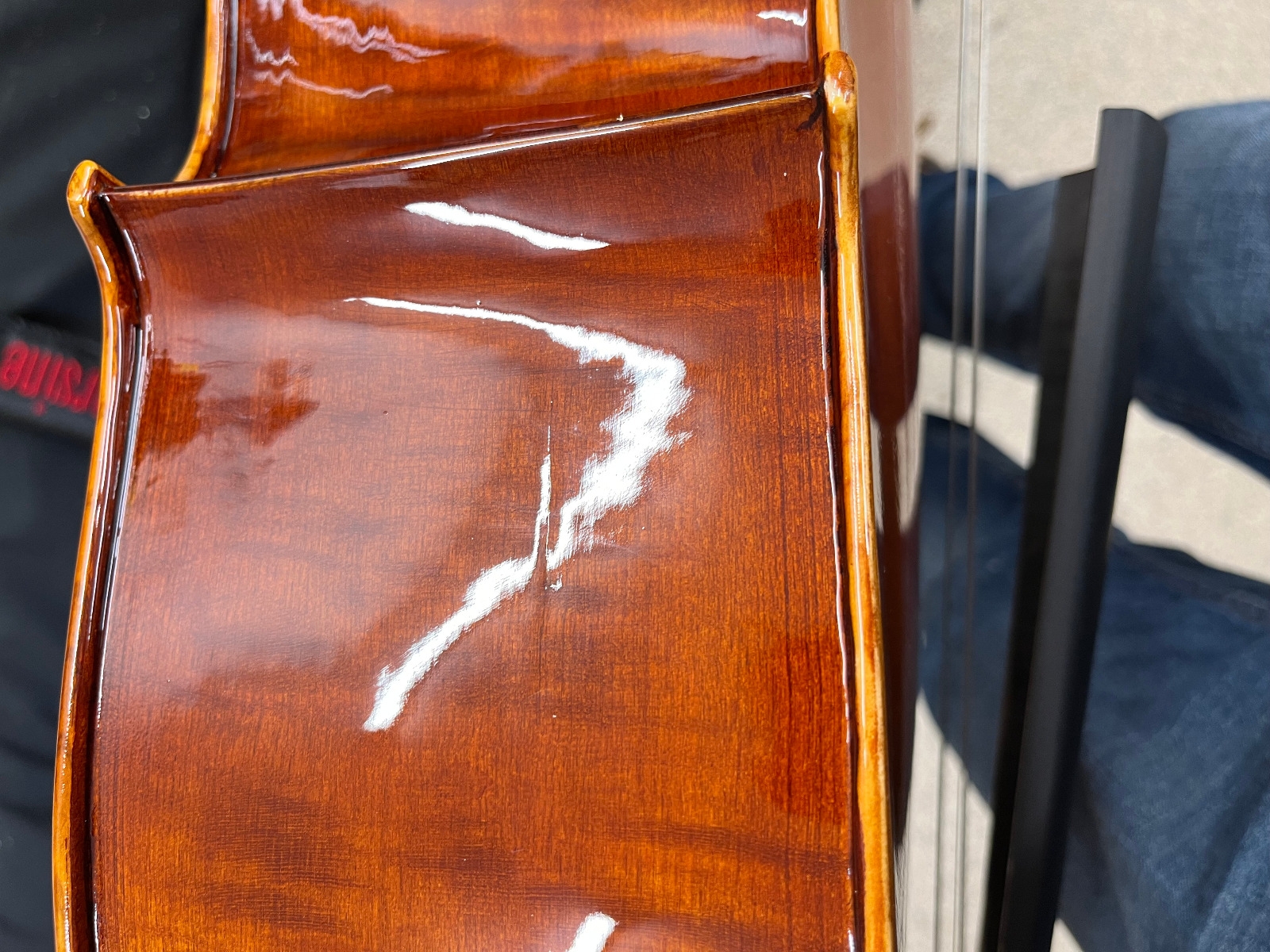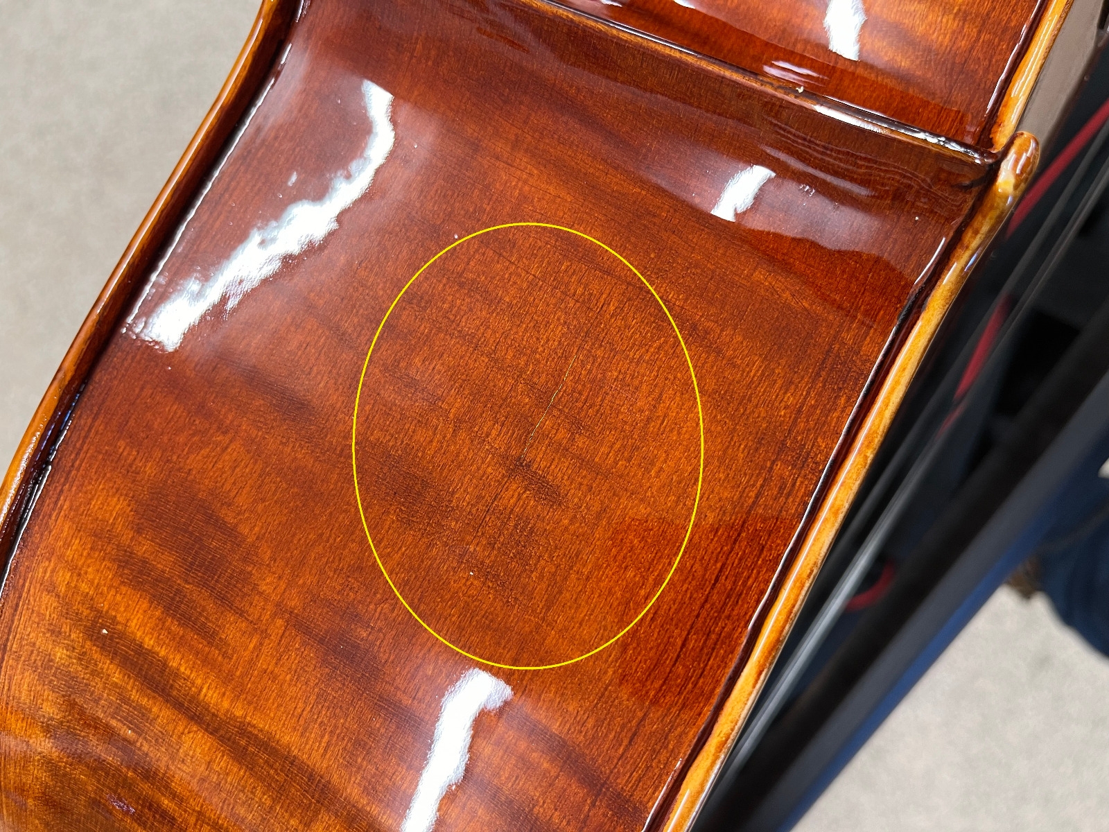 Hand-Carved, Solid Straight-grained Spruce top; Hand-Carved, Solid Flamed Maple Back, Ribs, Neck and Scroll; Ebony Fingerboard and Pegs; Seasoned Maple Bridge; Lightweight Tailpiece; Carbon Fibre Endpin; Steel Strings.
