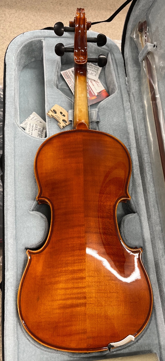 Hand-Carved, Solid Straight-grained Spruce top; Hand-Carved, Solid Flamed Maple Back, Ribs, Neck and Scroll; Ebony Fingerboard, Pegs and Chin Rest; Seasoned Maple Bridge; Light Alloy Tailpiece with Gilt Adjusters; Hidersine Synthetic Core Strings.