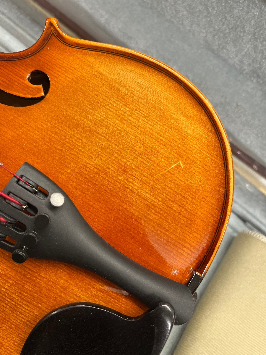 Hand-Carved, Solid Straight-grained Spruce top; Hand-Carved, Solid Flamed Maple Back, Ribs, Neck and Scroll; Ebony Fingerboard, Pegs and Chin Rest; Seasoned Maple Bridge; Light Alloy Tailpiece with Gilt Adjusters; Hidersine Synthetic Core Strings.