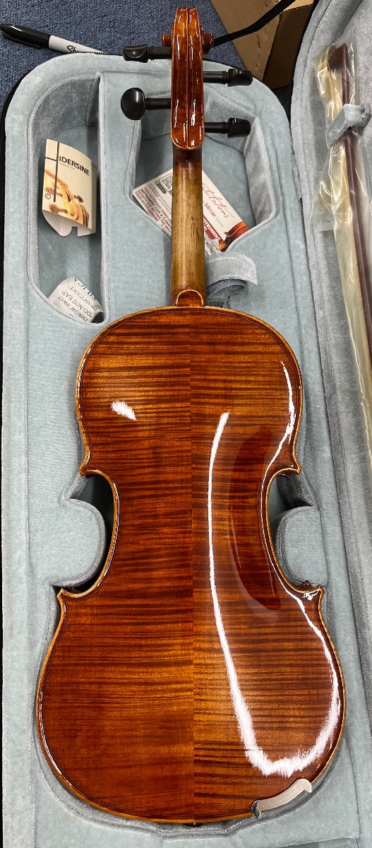 Hand-Carved, Solid Straight-grained Spruce top; Hand-Carved, Solid Flamed Maple Back, Ribs, Neck and Scroll; Ebony Fingerboard, Pegs and Chin Rest; Seasoned Maple Bridge; Light Alloy Tailpiece with Gilt Adjusters; Hidersine Synthetic Core Strings.