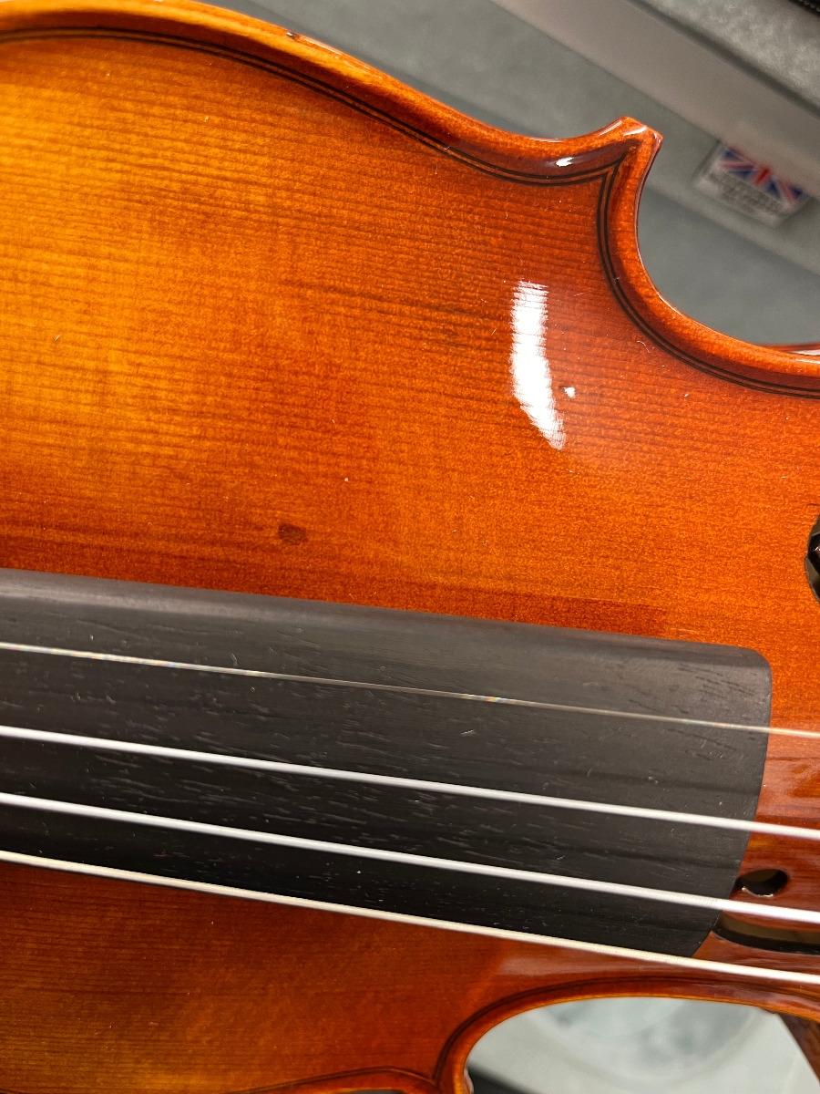 Hand-Carved, Solid Straight-grained Spruce top; Hand-Carved, Solid Flamed Maple Back, Ribs, Neck and Scroll; Ebony Fingerboard, Pegs and Chin Rest; Seasoned Maple Bridge; Light Alloy Tailpiece with Gilt Adjusters; Hidersine Synthetic Core Strings.