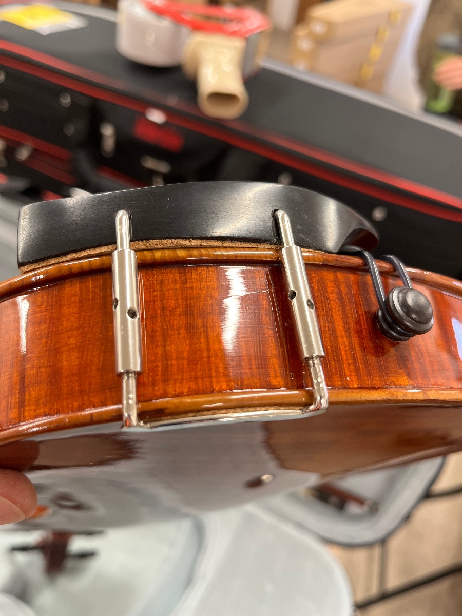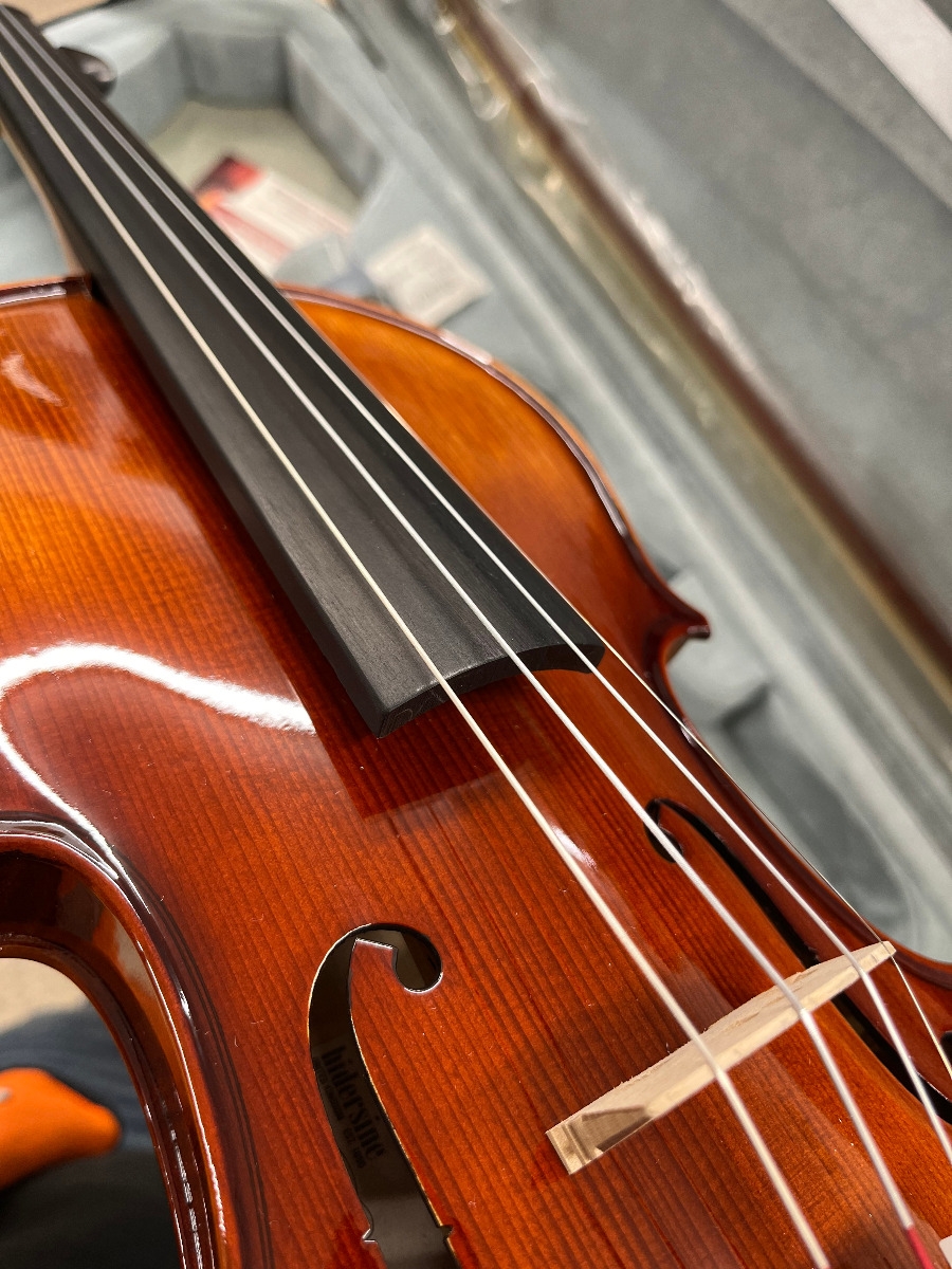 Hand-Carved, Solid Straight-grained Spruce top; Hand-Carved, Solid Flamed Maple Back, Ribs, Neck and Scroll; Ebony Fingerboard, Pegs and Chin Rest; Seasoned Maple Bridge; Light Alloy Tailpiece with Gilt Adjusters; Hidersine Synthetic Core Strings.