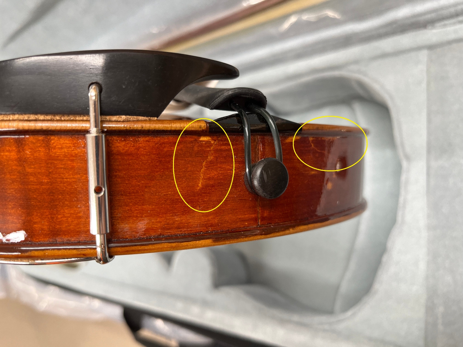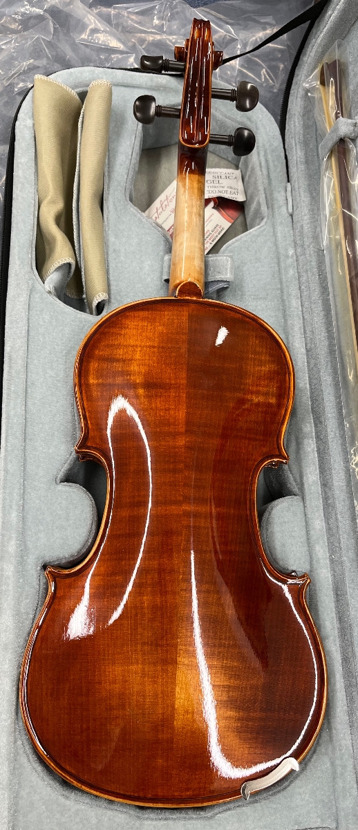 Hand-Carved, Solid Straight-grained Spruce top; Hand-Carved, Solid Flamed Maple Back, Ribs, Neck and Scroll; Ebony Fingerboard, Pegs and Chin Rest; Seasoned Maple Bridge; Light Alloy Tailpiece with Gilt Adjusters; Hidersine Synthetic Core Strings.