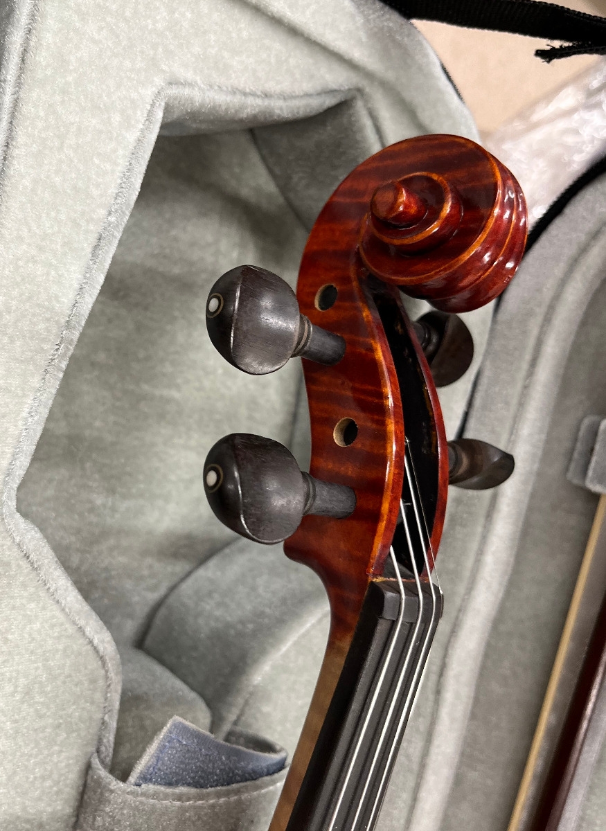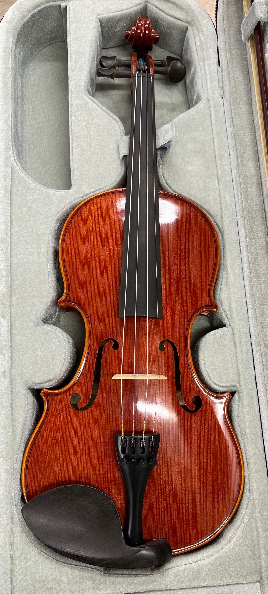 Hand-Carved, Solid Straight-grained Spruce top; Hand-Carved, Solid Flamed Maple Back, Ribs, Neck and Scroll; Ebony Fingerboard, Pegs and Chin Rest; Seasoned Maple Bridge; Light Alloy Tailpiece with Gilt Adjusters