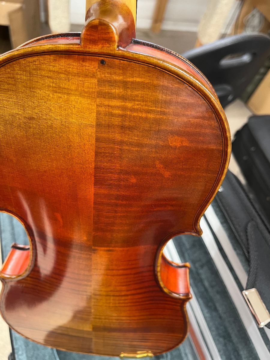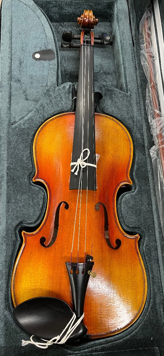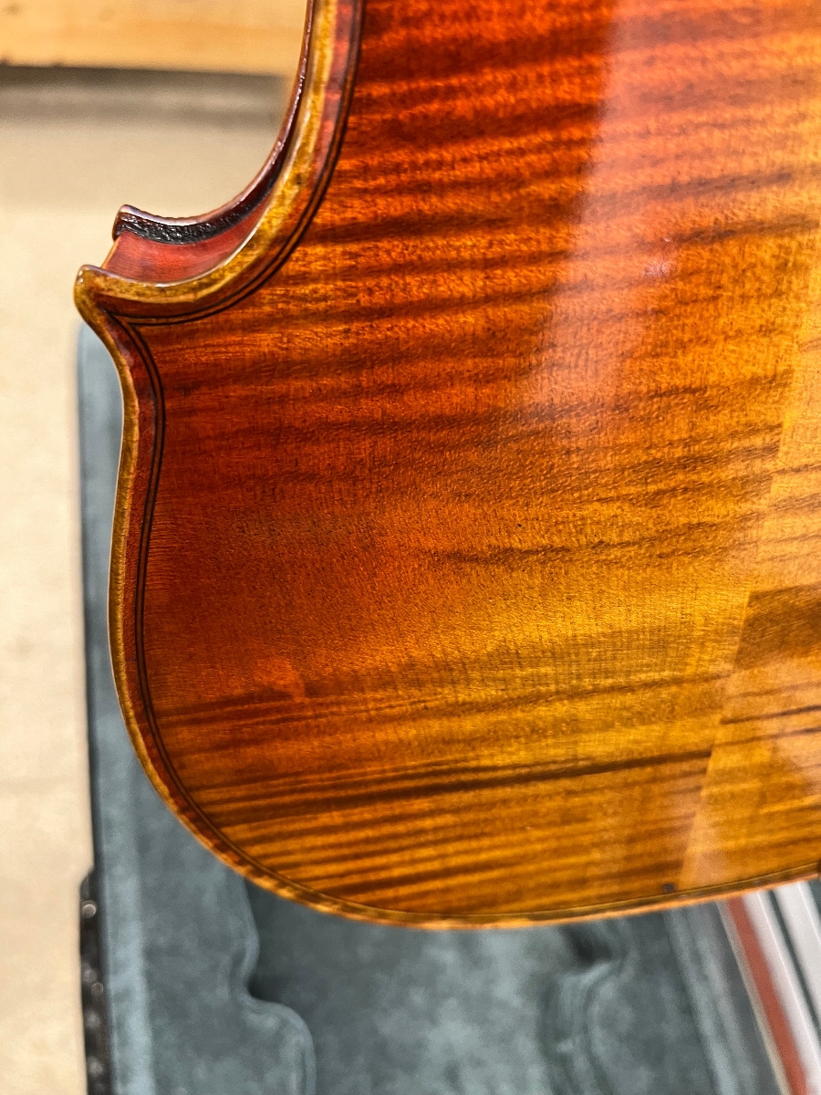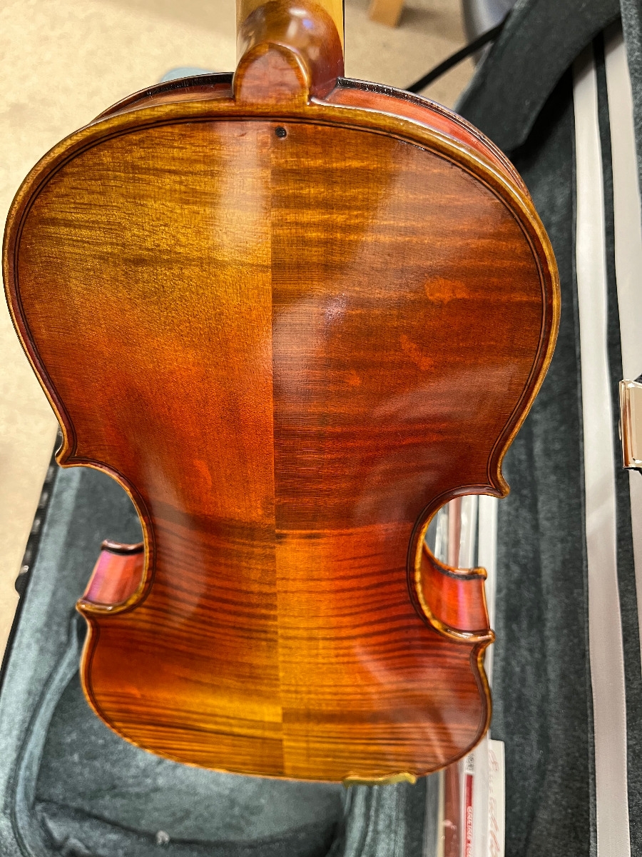 Selected, Hand-carved Spruce Top; Selected, Hand-carved Maple Back, Ribs, Neck and Scroll; Ebony Fingerboard, Pegs, End Pin, Tailpiece and Chin Rest; Single gilt finetune tailpiece adjuster; Antique, oil-based varnish application.