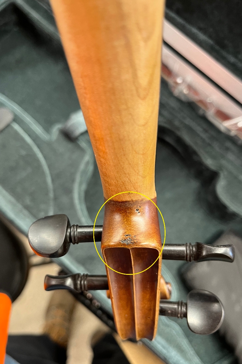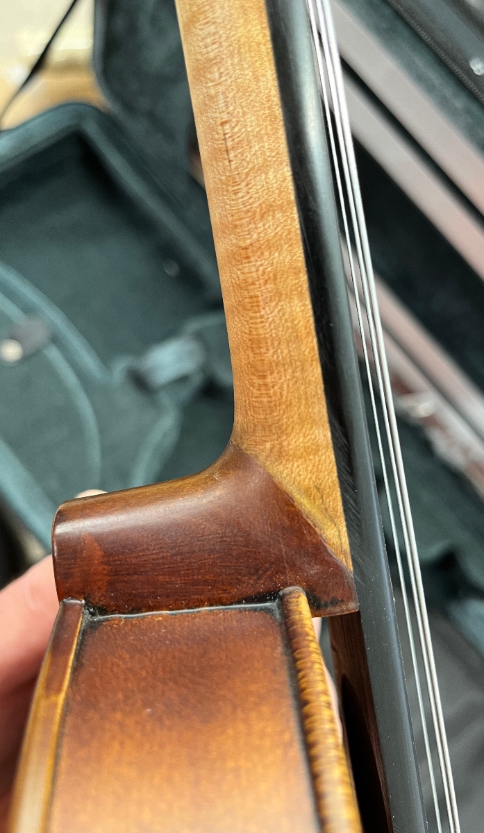 Hand-Carved, Solid Straight-grained Spruce top; Hand-Carved, Solid Flamed Maple Back, Ribs, Neck and Scroll; Spirit Varnish; Ebony Fingerboard, Pegs, Tailpiece and Chin Rest; Antiqued Finish, Seasoned Maple Bridge; Ebony Tailpiece with Single string finetuner.