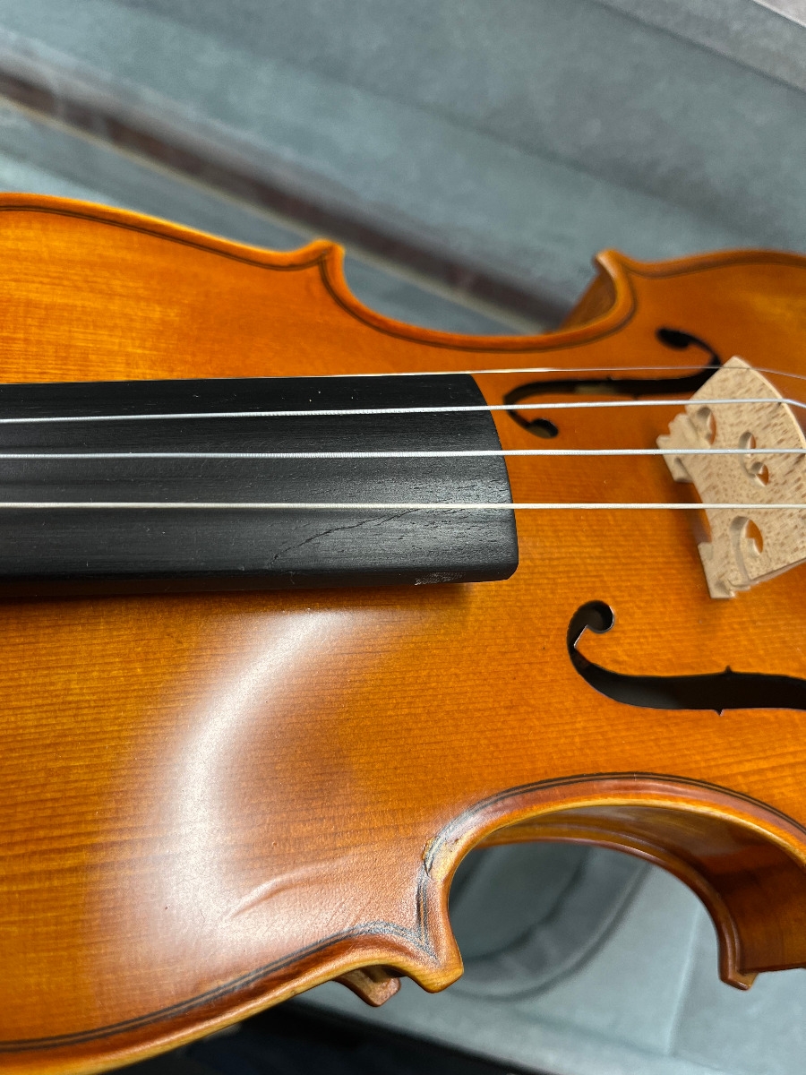 Solid Spruce Table, Solid Maple back and ribs with graphic flame, Carved Maple Neck, Genuine Ebony fingerboard and pegs, Alloy Tailpiece, Hidersine H100 Synthetic Core Strings.