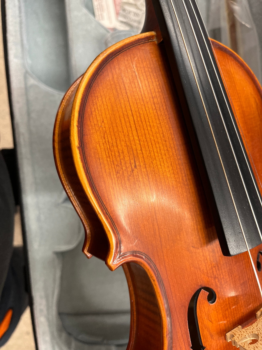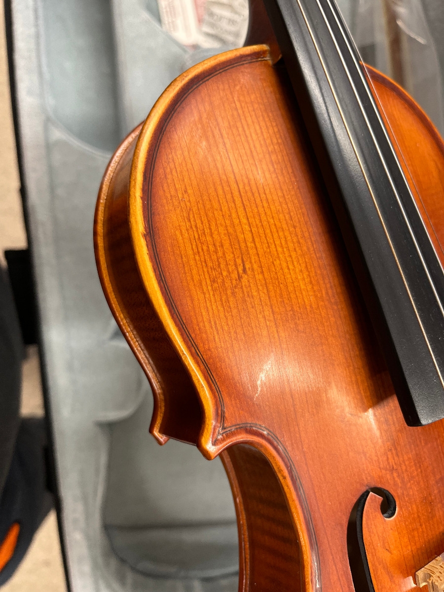 Solid Spruce Table, Solid Maple back and ribs with graphic flame, Carved Maple Neck, Genuine Ebony fingerboard and pegs, Alloy Tailpiece, Hidersine H100 Synthetic Core Strings.