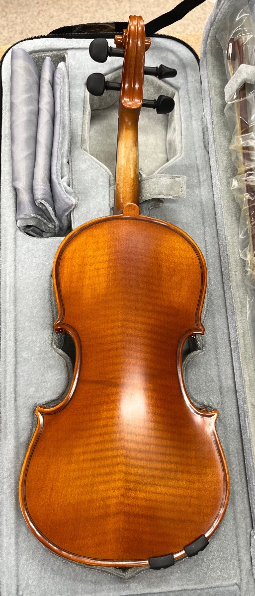 Solid Spruce Table, Maple back and ribs with graphic flame, Maple Neck, Genuine Ebony fingerboard, Premium Wittner Fine-Tune Pegs, Premium Wittner side-mounted, hypo-allergenic chin rest, Ebony Tailpiece with single adjuster, Synthetic Core Strings.