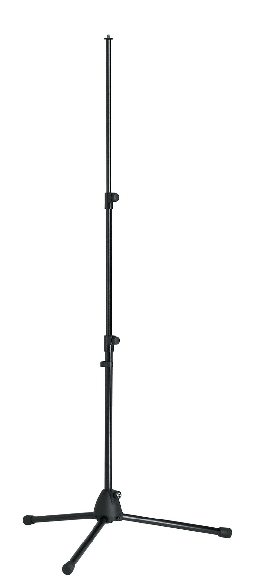 Extremely compact microphone stand. Three-piece shaft, non-marring height-adjustment system, lightweight plastic base with folding legs.