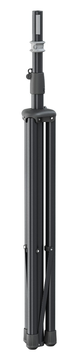 A patented expanding mandrel with quick-release fastener ensures a tight fit of the speaker cabinet. The plastic expansion splints ensure a vibration-free connection between the speaker cabinet and the tube. The height of the steel stand ranges from 1,417 to 2,117 mm, is fixed with a safety hook and secured by a clamping screw for a vibration-free and firm fit. Other features include a pull-out guard for the extension tube, an integrated shock absorber and durable powder coating.